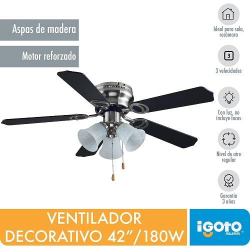 Tensión 110-127V – Potencia motor: 60W – Frecuencia: 60 Hz – Base: E27 – Con luz: E27 1 X 50W – RPM: 210/160/105 – Nivel de desplazamiento de aire: Moderado – Medidas: Medidas: Largo: (41 cm), Ancho (106 cm)